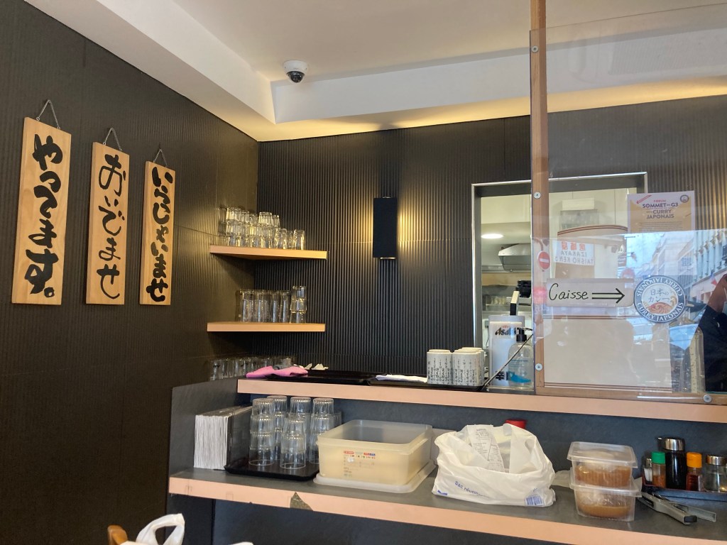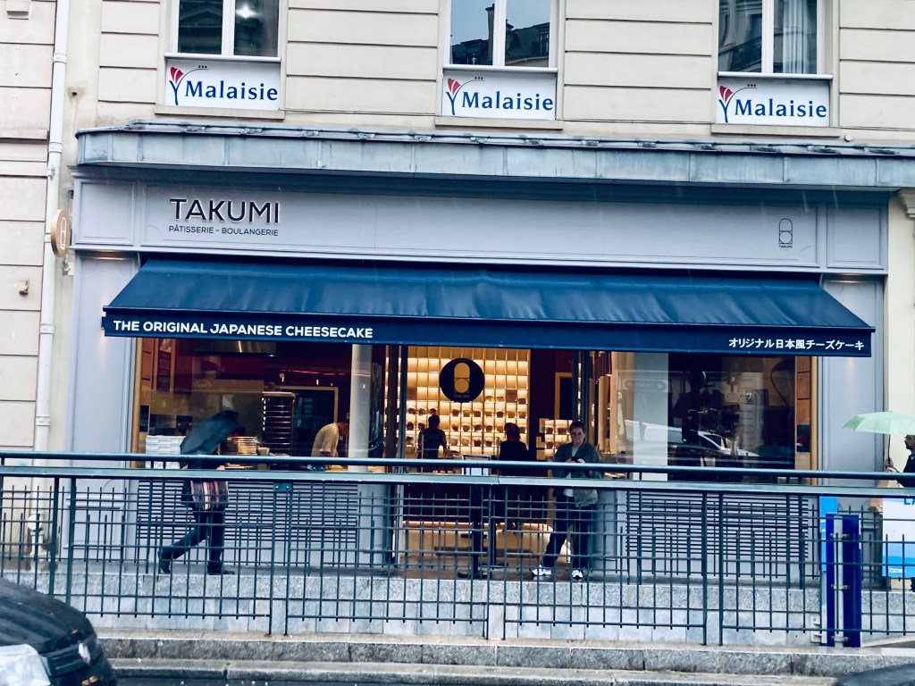 Percorriamo il boulevard e quando sappiamo mancare poche decine di metri la pioggia incessante invita a fermarsi per un caffè, ovviamente all’aperto ma riparati dalle tende, mentre sorseggio il mio cafè creme mi accendo una sigaretta ed alzando lo sguardo leggo Takumi Cheesecake. Per un attimo rimango perplessa, guardo meglio e poco distante riconosco il logo di kuroneko yamato.