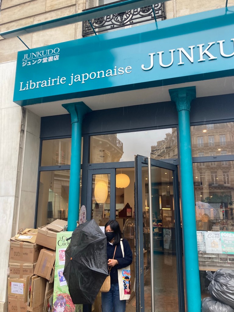 Terminiamo la pausa caffè e ci addentriamo nella strada della libreria, i palazzi sono quelli meravigliosi che sappiamo avere Parigi, eppure le vetrine e le insegne sono un susseguirsi di kanji, hiragana e katakana che mi ritrovo a scorrere come fossi una bambina delle elementari che riesce finalmente a leggere il primo libro di favole. Anche i profumi sono quelli che escono dalle botteghe giapponesi. Un leggero senso di smarrimento unito alla sensazione di essere a casa, mi riesce davvero complicato descrivere a parole.