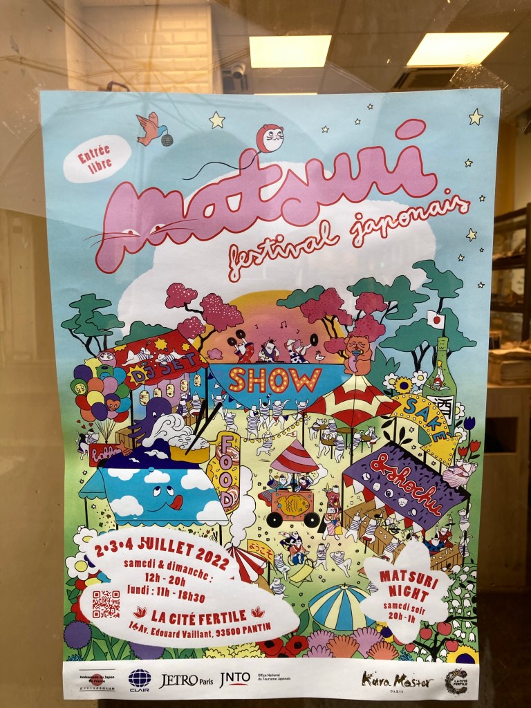 E poi, sulle vetrine di molti negozi un piccolo poster: MATSURI, ma davvero? Un matsuri a Parigi? Ma quando? Proprio in questi giorni? Cosa fai, non ci vai? Ovviamente ci vai, anche se dista 2 ore a piedi ma siccome sei fermo sulla tua decisione di fare lunghe passeggiate nulla ti fermerà, nemmeno la strada che ad un certo punto diventa deserta e poi malfrequentata, nemmeno il campo di tossicodipendenti nel quale passiamo ignari e in silenzio (impauriti, tanto, ma ormai eravamo lì e il navigatore non forniva strade alternative) insieme ad altre due fanciulle in yukata che ci precedevano a passettini svelti di fronte a noi, e no, nemmeno la polizia che ci ha fermato una volta usciti dal campo per chiederci cosa facessimo lì in mezzo: gli abbiamo mostrato le locandine dell’evento e spiegato che eravamo turisti. Ci hanno praticamente detto che eravamo degli imbecilli ed eravamo stati fortunati, di fare una strada diversa al ritorno e tanti saluti.
